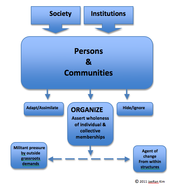 And some choose activism- those who reject the other options of either assimilating or hiding and instead organize for social change. By organizing with the goal of asserting the wholeness of individual and collective identities and inclusion and ownership of our own narratives, and equal rights, people and communities strategize along the continuum of working outside the institutions or within. Let me be clear that these are not the only ways to be an activist. Being an activist may mean supporting adoptee projects and programs, artists, attending adoptee social events, etc. [Edited to add: And research!! How could I have forgotten to add conducting and supporting research!?!] Activism can mean many things.