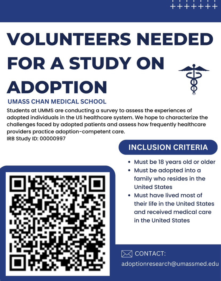 I wanted to pass on this call for adoptee participants for a study about adoptees and health care. I think this is an important topic and encourage everyone to participate. From the research flyer: the study aim is to assess the experiences of adopted individuals in the US healthcare system. They hope to understand the challenges faced by adoptee patients, and adoption-competent care by healthcare providers. One of the researchers is an adoptee. You can get more information at adoptionresearch@umassmed.edu or use the QR code in this image to participate.