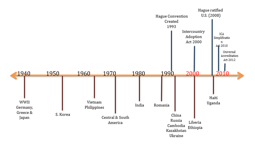This timeline was created for my research project. It shows the early origins of intercountry adoption by decade along with the countries that were major sending countries to the U.S. during specific decades. It also depicts the policies that govern intercountry adoption – it is pretty stark to see that the length of time it took for the U.S. to enact legislation providing oversight (however one feels about the quality of that legislation and/or oversight) that it was very late in the game overall. Also, in red you can see that years that the U.S. Census asked about adopted children in households.